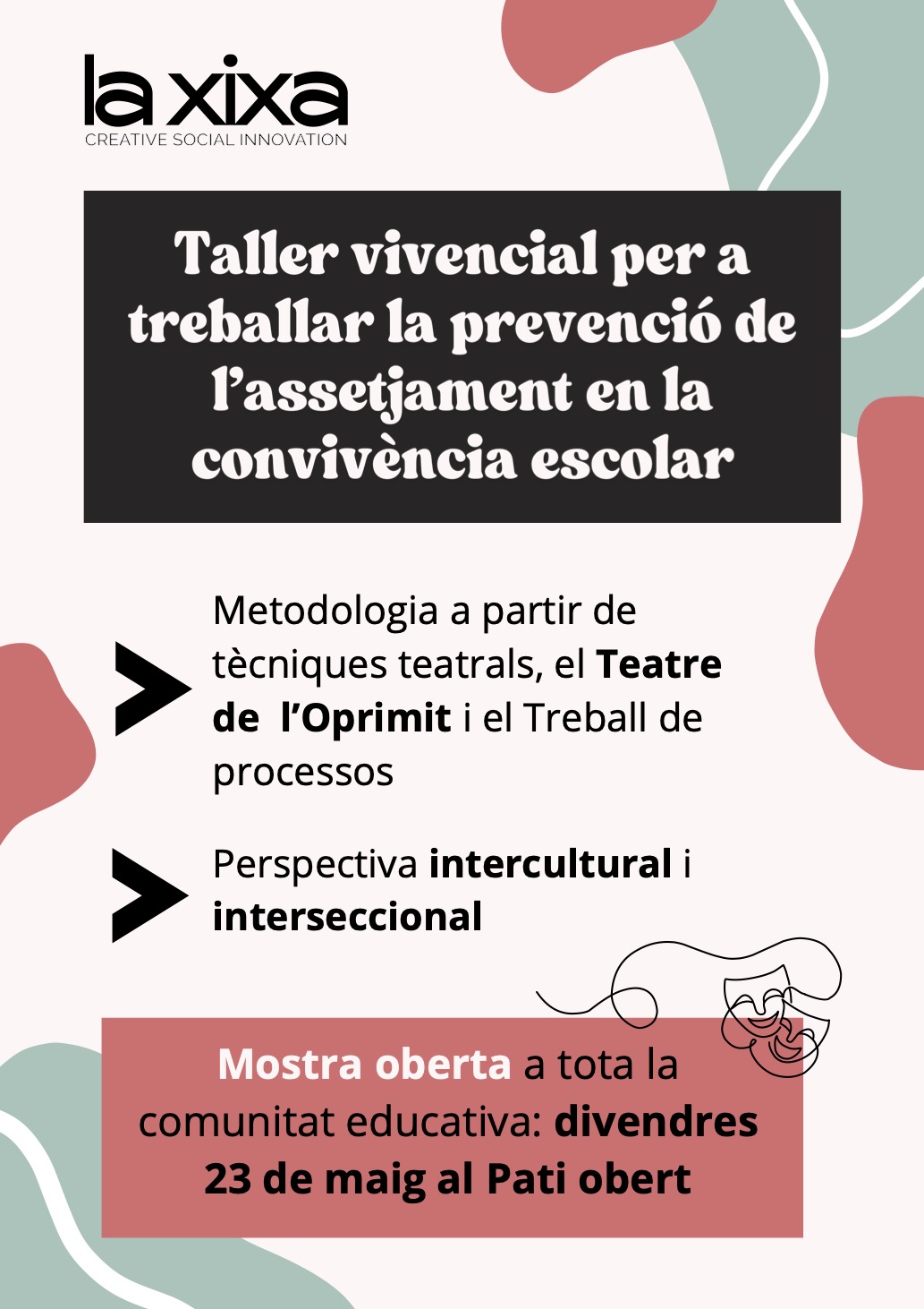 La comissió de convivència organitza uns tallers, adreçats als nens i nenes dels grups de cinquè i sisè i a càrrec de la Xixa Teatre. L’objectiu d’aquests tallers és oferir als infants un espai de reflexió i diàleg sobre la importància de crear entorns segurs i respectuosos, on tothom se senti valorat i escoltat. A través d’activitats vivencials, es treballarà la prevenció de l’assetjament i la promoció del bon tracte, explorant situacions quotidianes i buscant solucions basades en l’empatia, el respecte i la col·laboració. La metodologia es fonamenta en la facilitació de grups, el treball de processos i el teatre de l’oprimit. Es posarà especial èmfasi en identificar actituds i dinàmiques que poden generar situacions d’exclusió o desigualtat, alhora que es fomentarà la cerca de formes assertives i positives per resoldre conflictes.